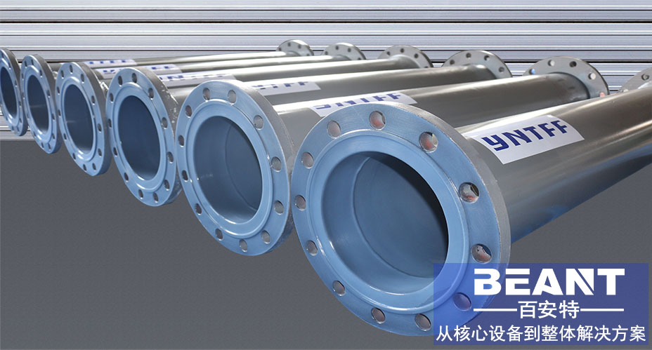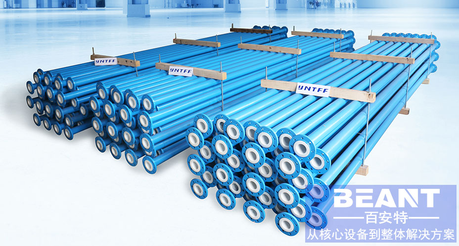 襯氟推壓管道是將鋼件焊接加工完成后,將PTFE成品塑料管通過機(jī)械拉力拉入預(yù)制好的直管中,使內(nèi)襯層與鋼件緊密結(jié)合;然后通過火焰加熱或鹽藥水加熱,使密封普通PTFE管到一定溫度,翻邊成型為密封面;后再進(jìn)行應(yīng)力消除。